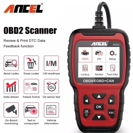ANCEL AS500 is a CAN/OBDII/EOBD universal car scanner that provides easiest and cost-effective solution for OBD faults and battery status check, including Read Codes, Erase Codes, Live Data, View Freeze frame, Read I/M Readiness Status Data, O2 Monitor Test, On-board Monitor Test, Vehicle Information, DTCs Look up, Data Review, Print Data, Component Test, Modules Present and Unit of measure.