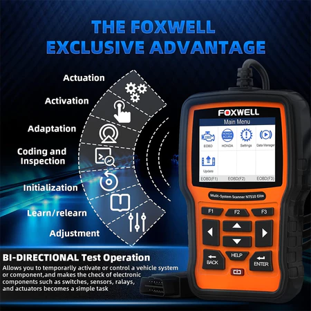 FOXWELL NT510 Elite is the most cost-effective professional scan tool It does not only include basic functions such as codes and live data, but also is capable of advanced functions such as actuation, adaptation and programming. In addition, it lets you to access the most commonly required service features such as oil service light reset, throttle body adjustment, DPF regeneration and much more.